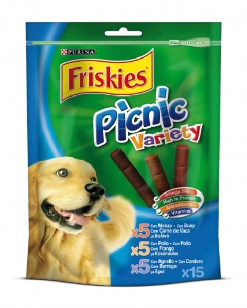 FRISKIES DOG PICNIC VARIETY SNACK son una delicisioa selección de snacks llenos de jugosidad. Puede darlo entero o trocearlo fácilmente. Antioxidantes para mantener las defensas naturales. Omega 3 & 6 para mantener una piel saludable y un pelaje brillante. Vitaminas para ayudar a un mantenimiento saludable y unos buenos niveles de energía. Alto contenido en proteínas para ayudar a mantener unos músculos fuertes.
